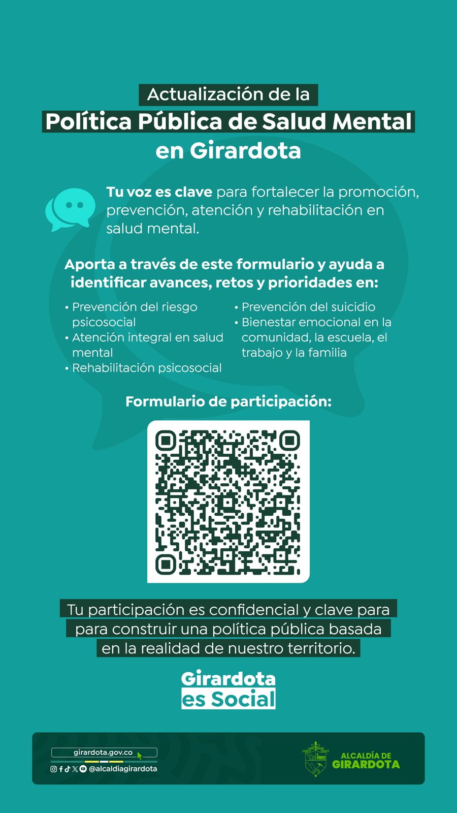 El Municipio de Girardota está actualizando su Política Pública de Salud Mental para fortalecer la promoción, prevención, atención y rehabilitación en salud mental con un enfoque integral, territorial y de derechos humanos y adecuarla a la Política Nacional  de Salud Mental  2024-2033. A través de este ejercicio de consulta se busca validar la formulación técnica con la ciudadanía, para asegurar que responda a las necesidades e intereses del territorio.