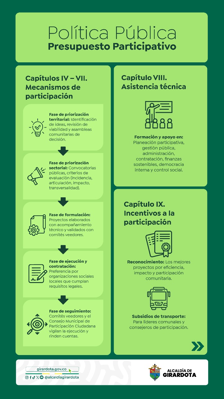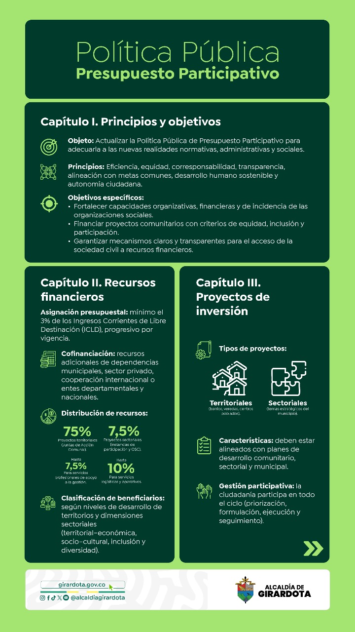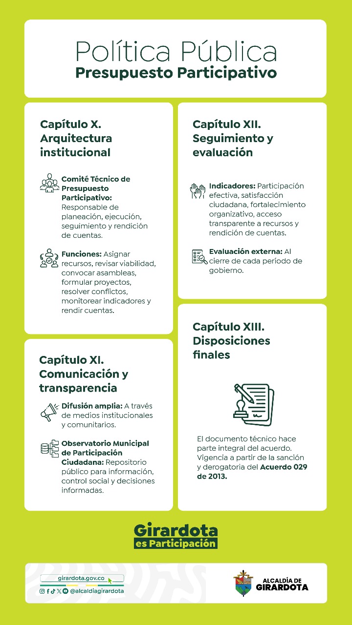 El Acuerdo 029 de 2013 creó en Girardota la política de presupuesto participativo, mediante la cual se destinan recursos públicos para financiar proyectos comunitarios. Sin embargo, al no contar con una reglamentación clara, su implementación ha tenido dificultades: no siempre ha sido continua, y en algunos casos ha afectado la efectividad de la participación ciudadana en las decisiones sobre el presupuesto.